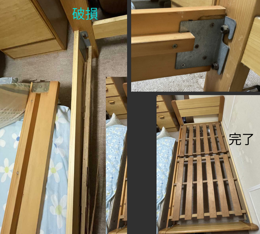 長年お使いの木製ベッドのスノコが落ちるので、直してほしいとのご依頼。