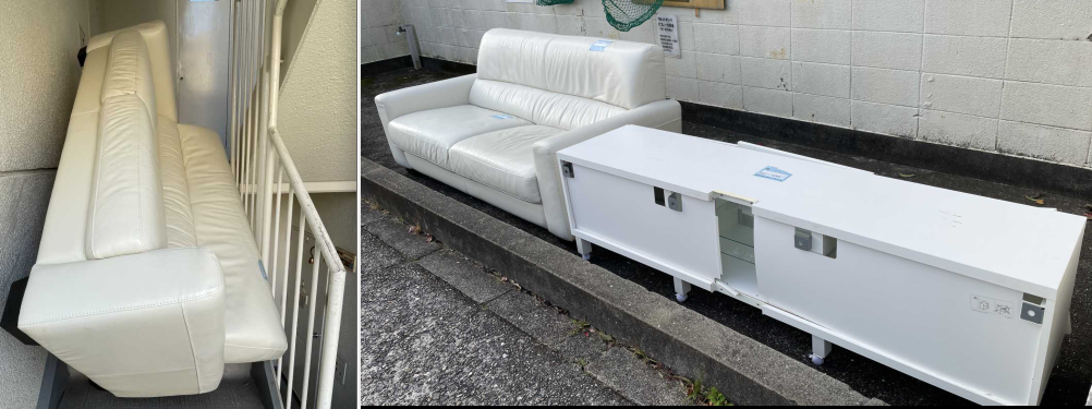 ご不用品の3人掛け革張りソファとTVボードとを搬出する作業。